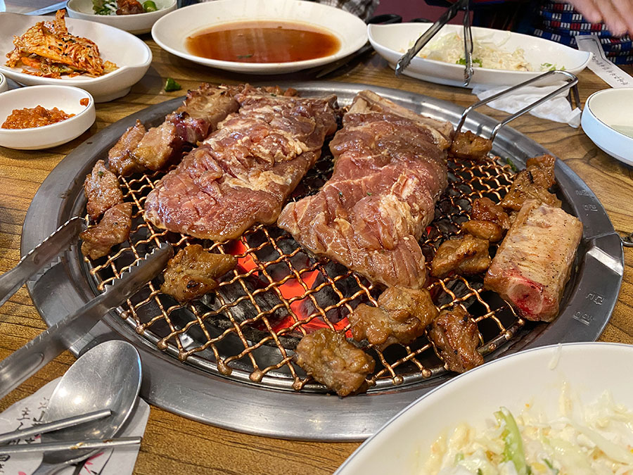 돼지갈비의 양념이 불판에 묻어 검게 타기는 하는데, 고기가 불판에 달라붙거나 검댕이 고기에 묻어나진 않아요.