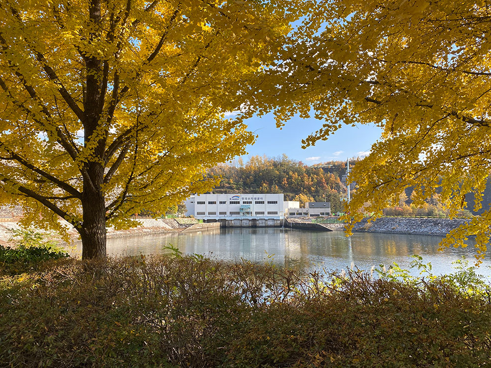 은행나무 사이로 보이는 한국수자원공사 안동댐 관리동.