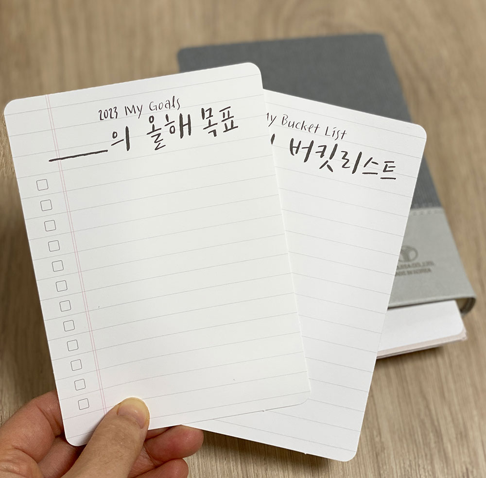 뒷표지를 열어보면 2023년의 목표와 버킷리스트를 적을 수 있는 카드가 들어있어요.