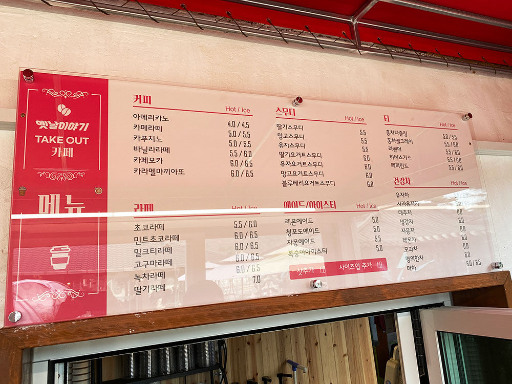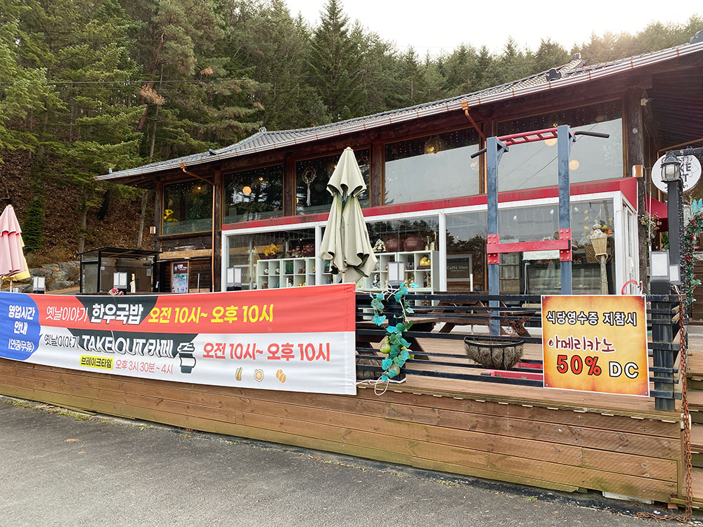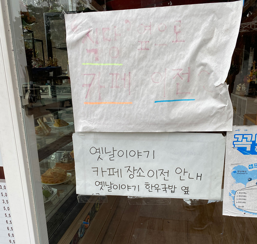 원래는 국밥집 옆이 아닌 주차장 바로 앞 건물 1층에 카페가 있었는데, 옛날이야기 한우국밥 옆으로 이전을 했대요.
