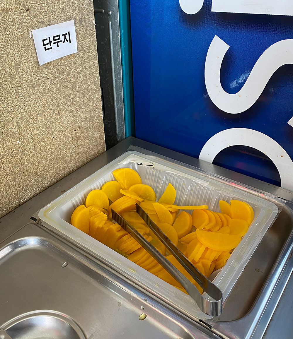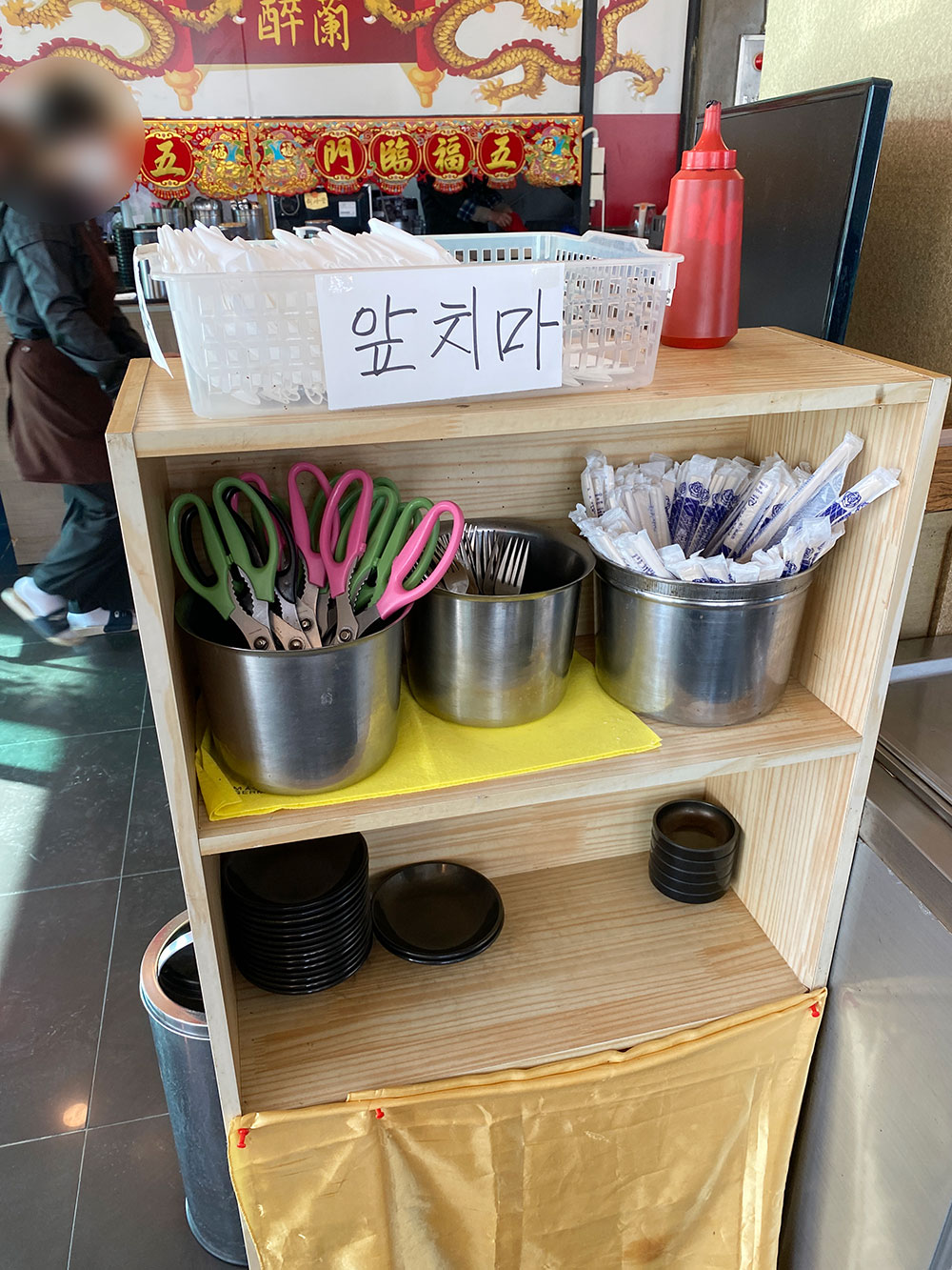 일회용 앞치마, 가위, 포크, 젓가락, 앞접시가 있고 산고추, 양파, 단무지가 더 필요하면 가져다 드시면 됩니다.