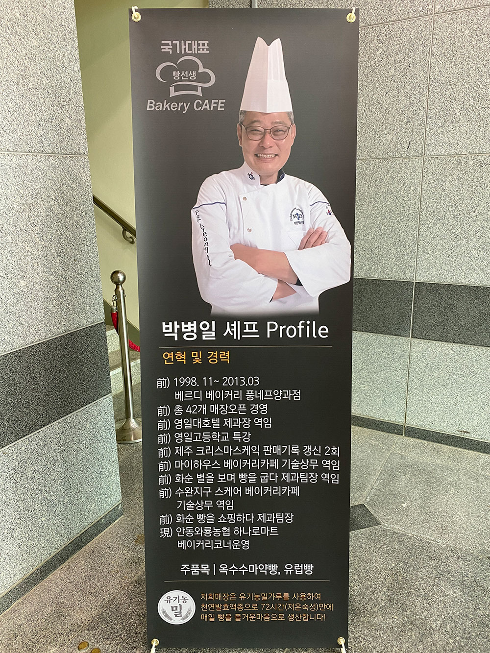 국가대표 빵선생의 대표 셰프인 박병일 셰프의 약력이 엘리베이터 앞에 적혀있어요.