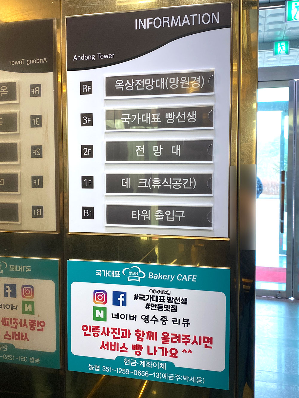 국가대표 빵선생 베이커피 카페가 있는 안동문화관광단지 전망타워입니다.