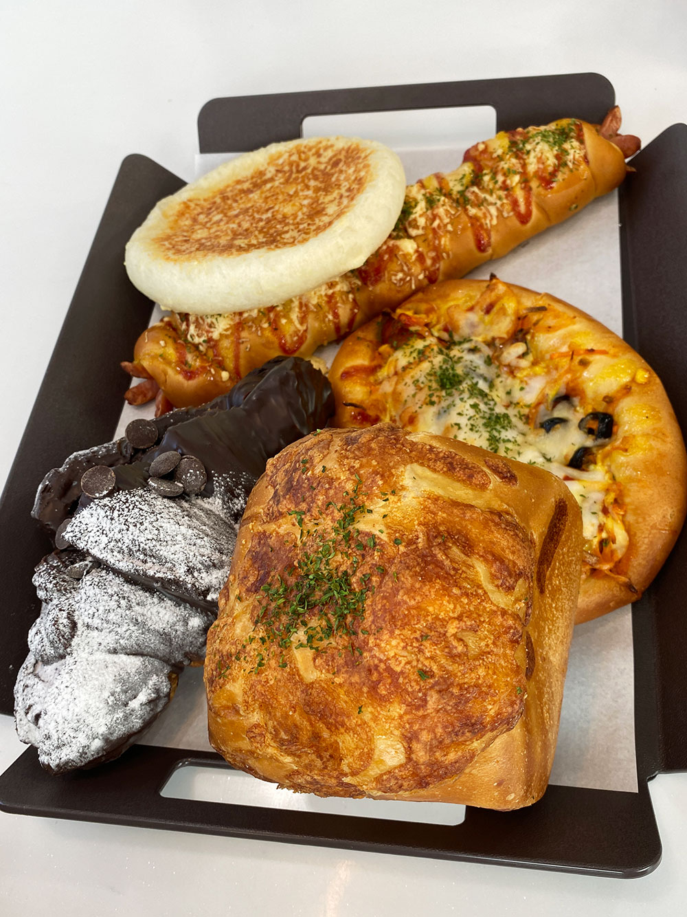 옥수수 마약빵과 초코 크로와상, 피자빵, 치즈호떡 등 5가지를 담고 계산대에서 음료를 주문하면서 함께 계산했어요.
