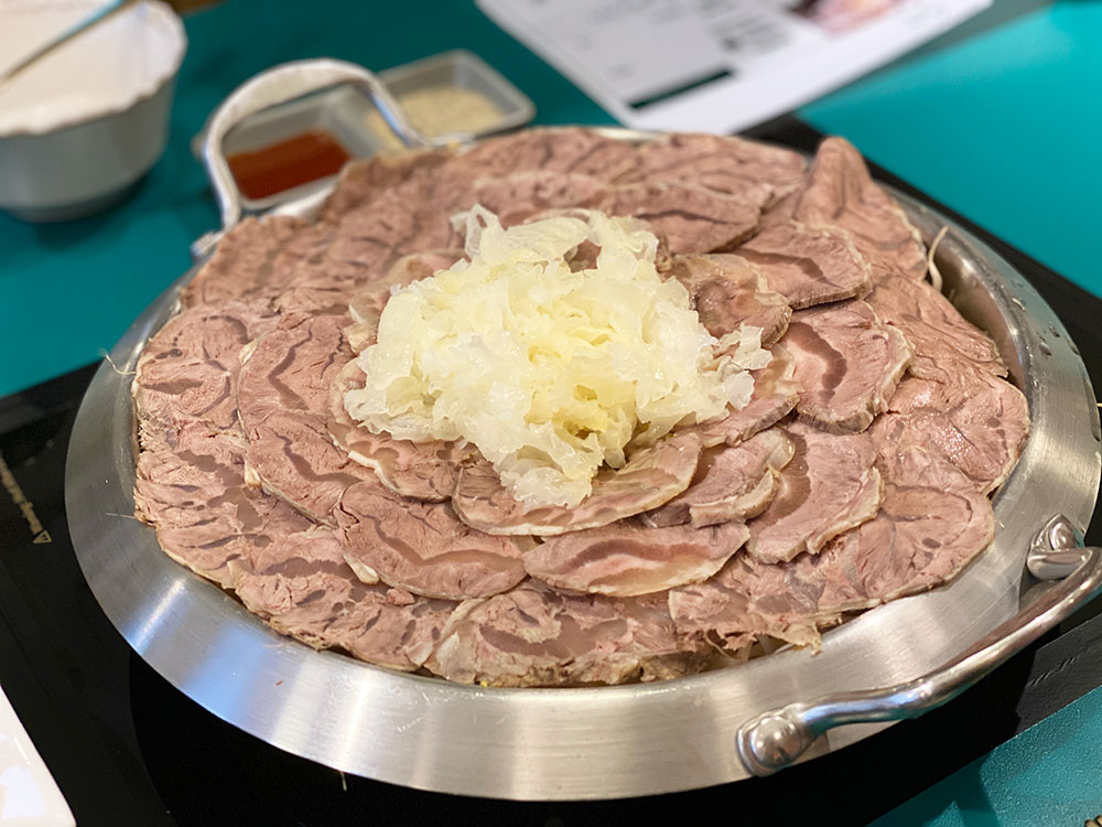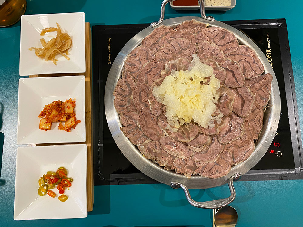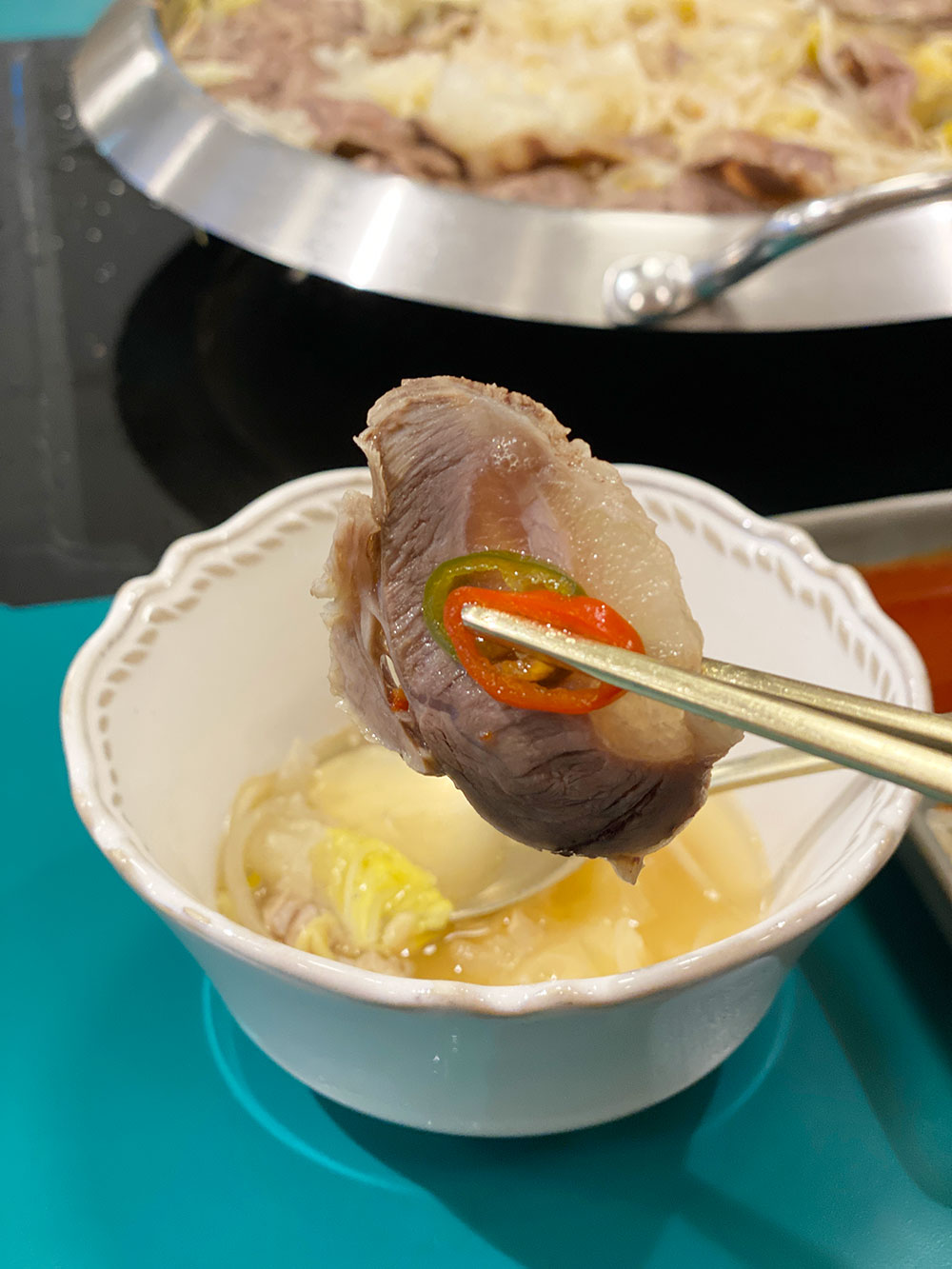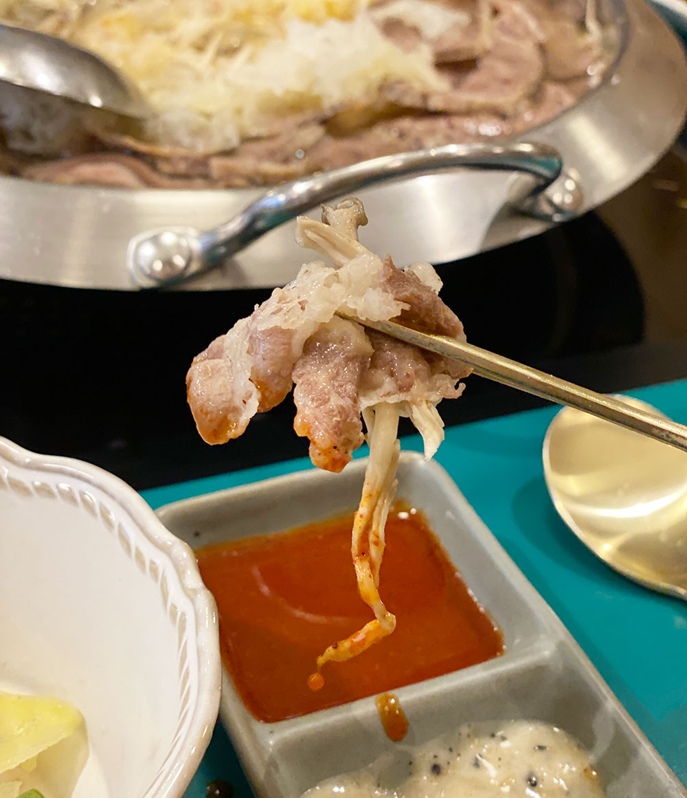 편백찜보다 아롱사태수육 전골이 먼저 나왔어요.