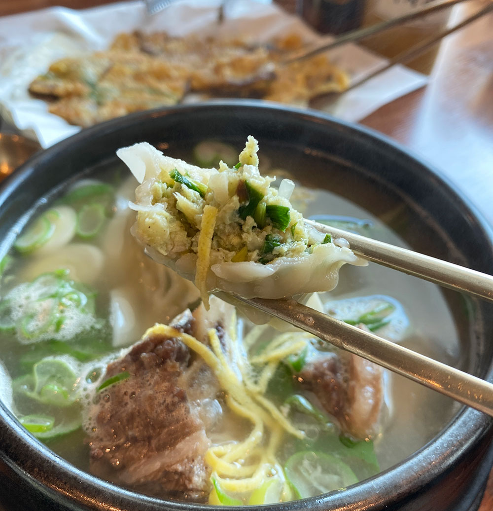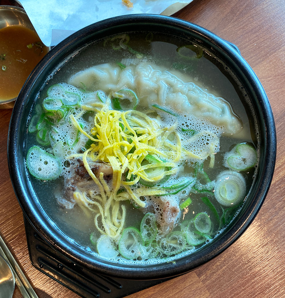 뚝배기에 속이 꽉차고 큼지막한 만두 2개, 갈비 2개가 들어있습니다.