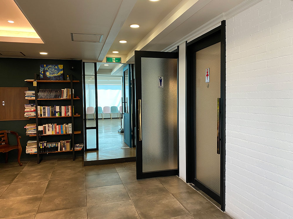 셀프바 옆 계단을 올라가서 오른쪽으로 꺾으면 바로 화장실입니다.
