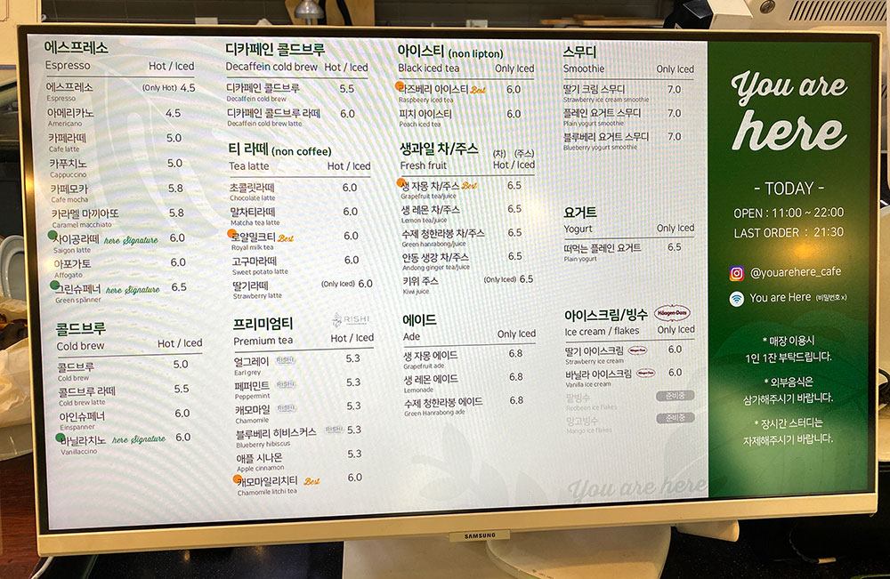 메뉴는 카운터의 스크린으로 확인 할 수 있답니다.