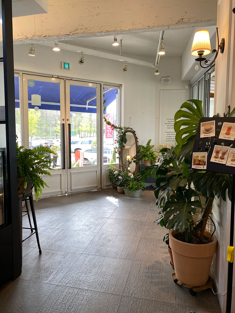 카페 입구로 들어서면 오드리헵번과 산뜻한 화분이 손님을 반깁니다.