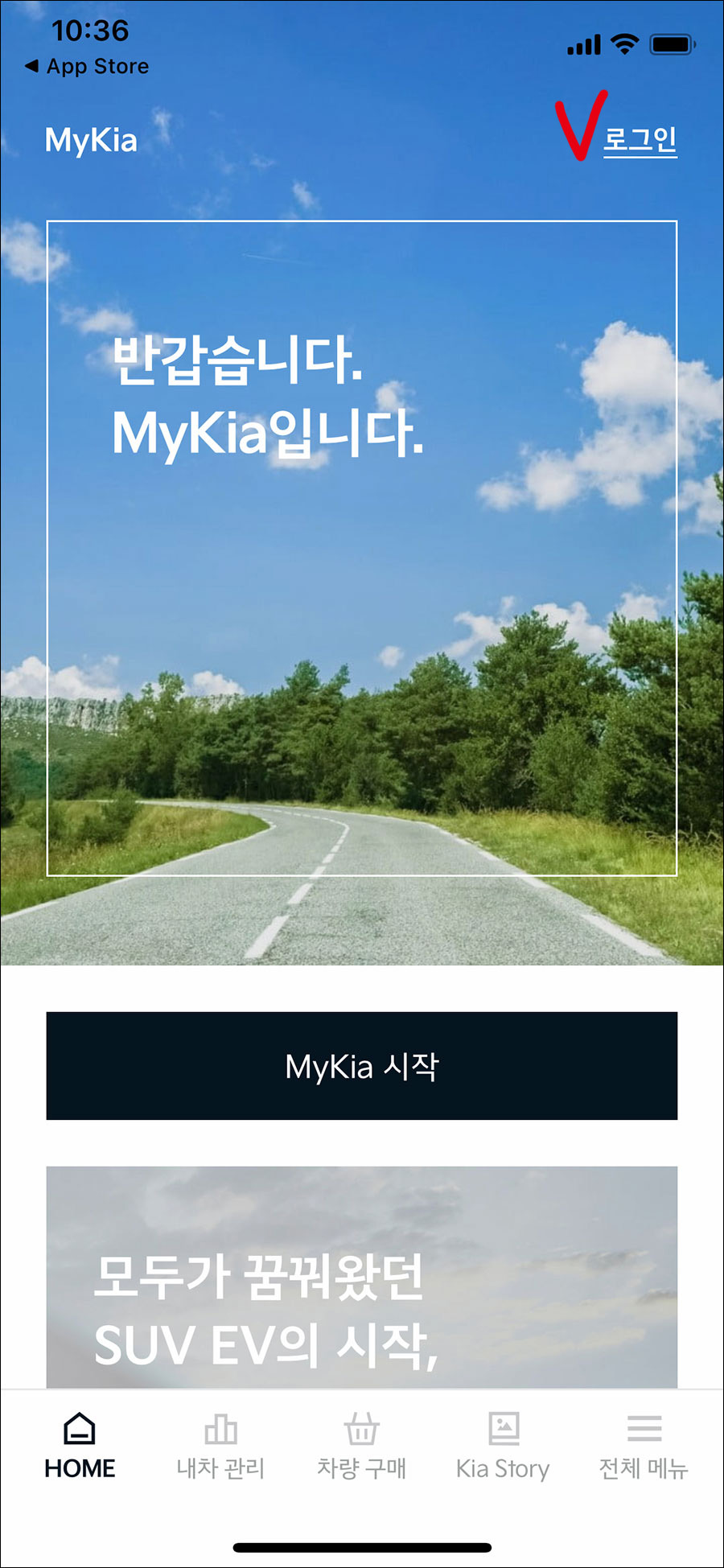 로그인 또는 마이기아 My Kia 시작 버튼을 눌러 로그인합니다.
