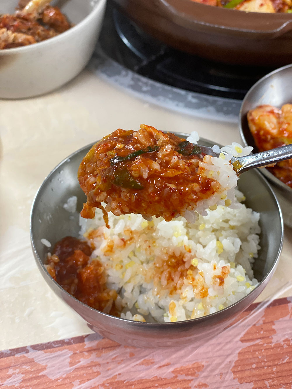 자글자글 졸아든 매콤한 닭도리탕의 양념에 밥을 비비면 밥알 하나하나에 양념이 베어 깊은 풍미를 느낄 수 있죠.