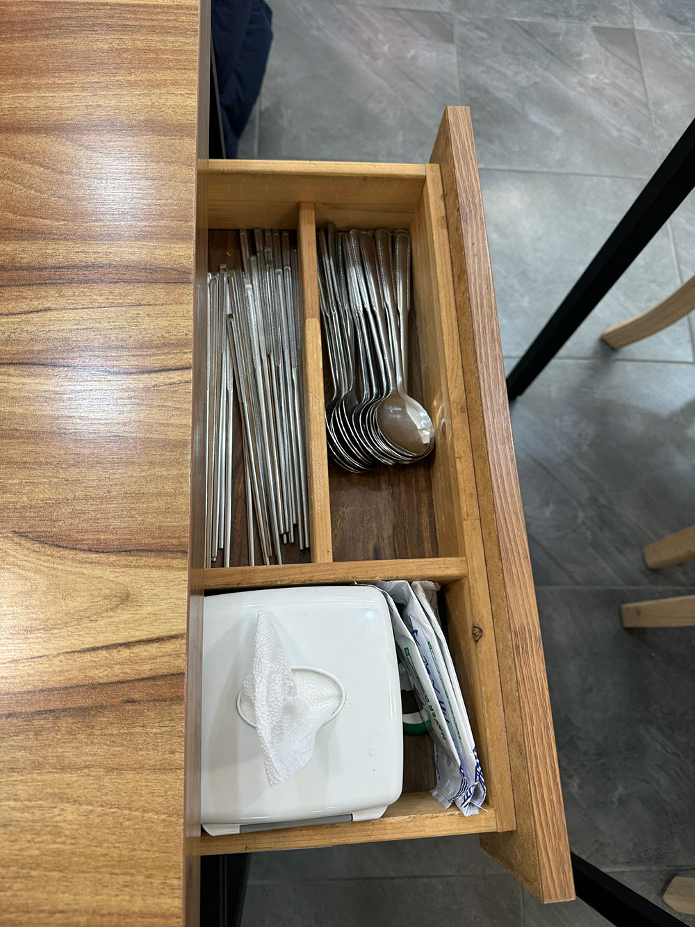 수저는 테이블 밑 서랍에 있고요.