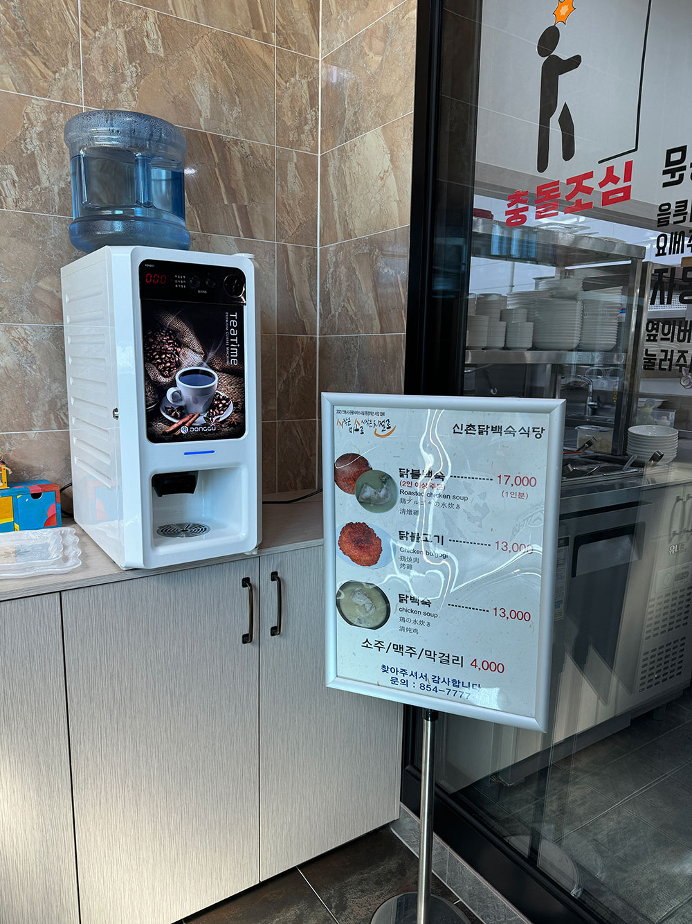 식당 입구에는 식사 후 마무리로 커피를 마실 수 있도록 자판기가 마련되어 있고, 스탠드형 메뉴판이 있습니다.
