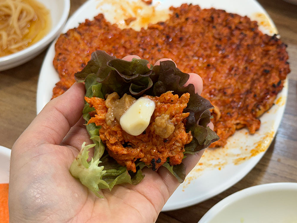 닭불고기와 함께 밑반찬과 쌈채소도 나오는데 고추장아찌, 양파장아찌 등 밑반찬을 올리고 쌈을 싸 먹으면 맛있어요.