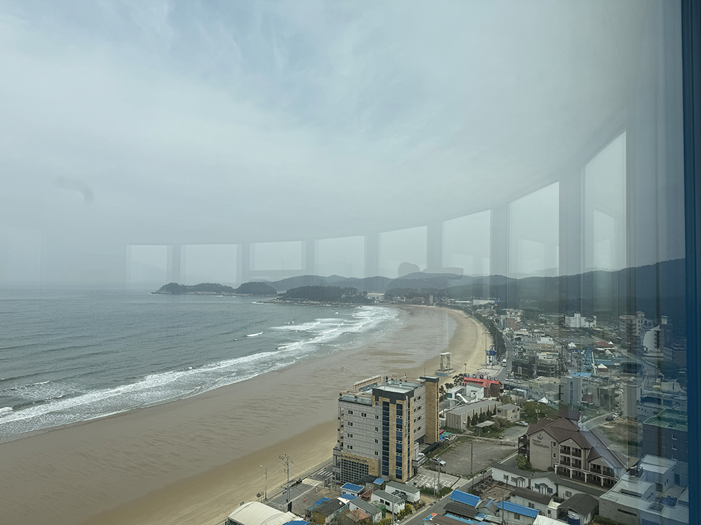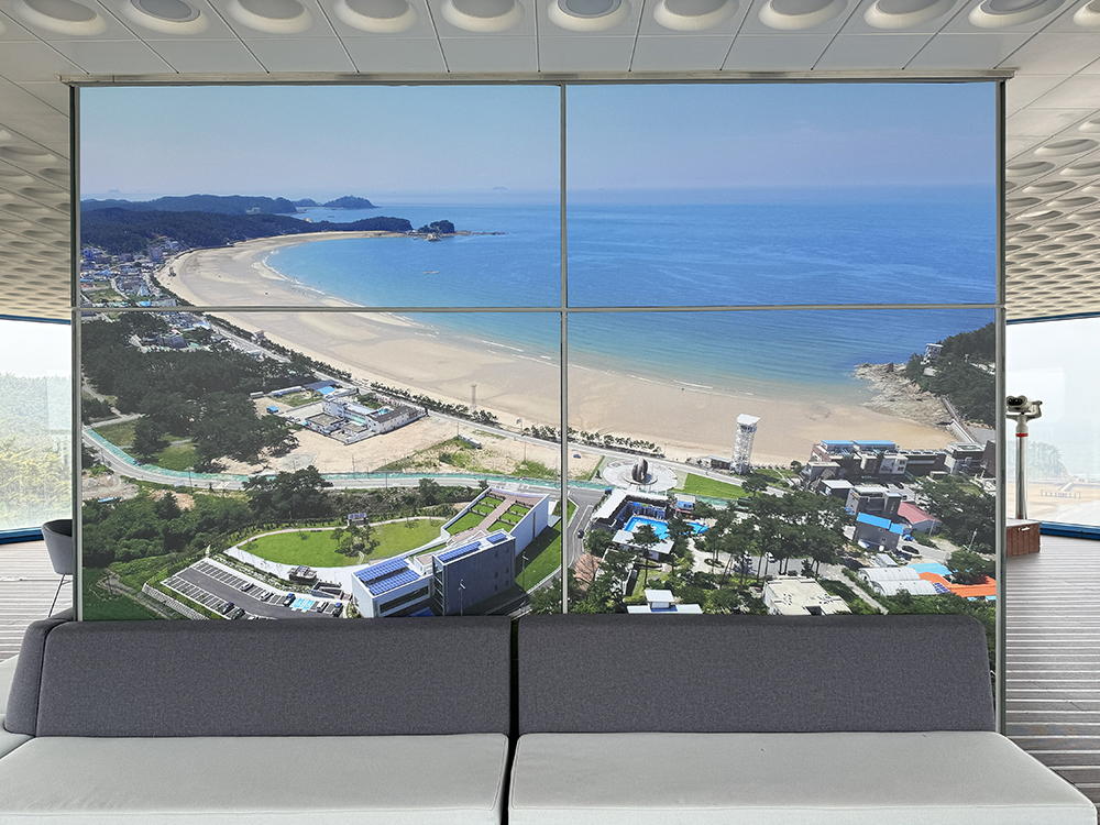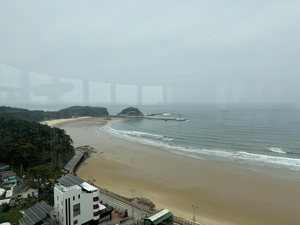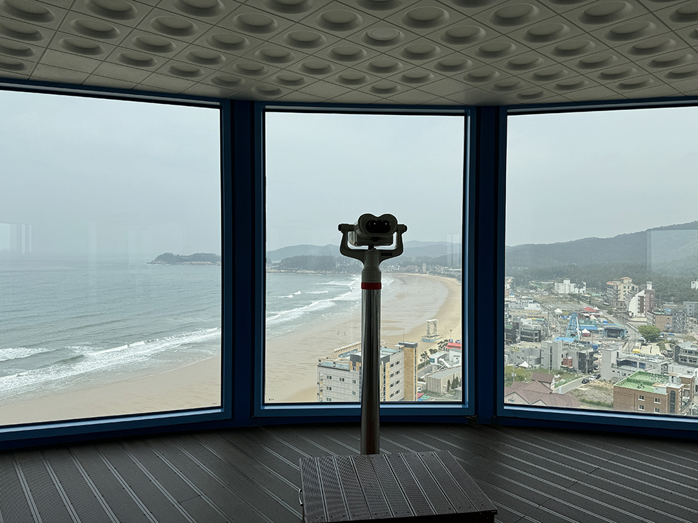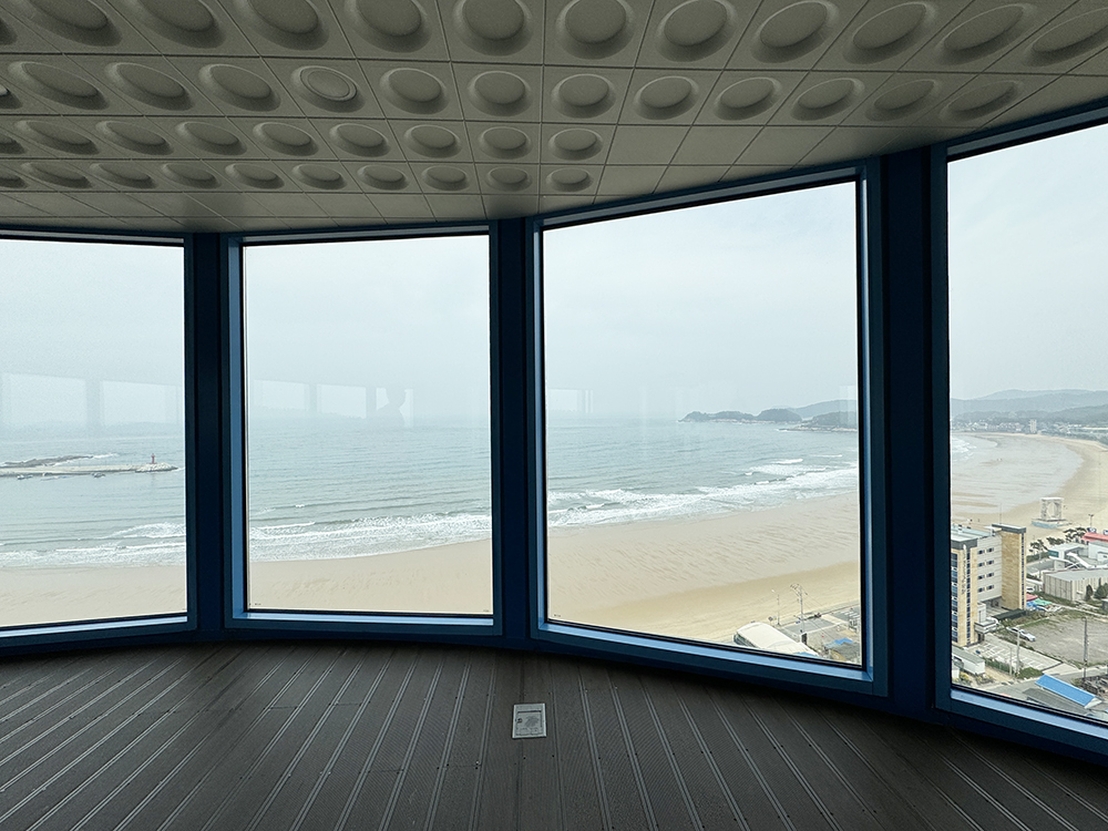 엘리베이터 문이 열리는 순간 마주하는 만리포 해수욕장의 전망입니다.