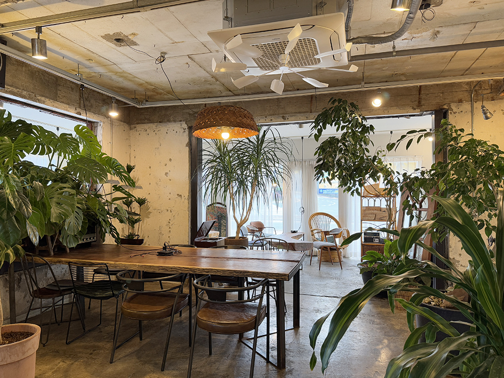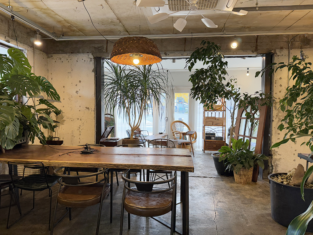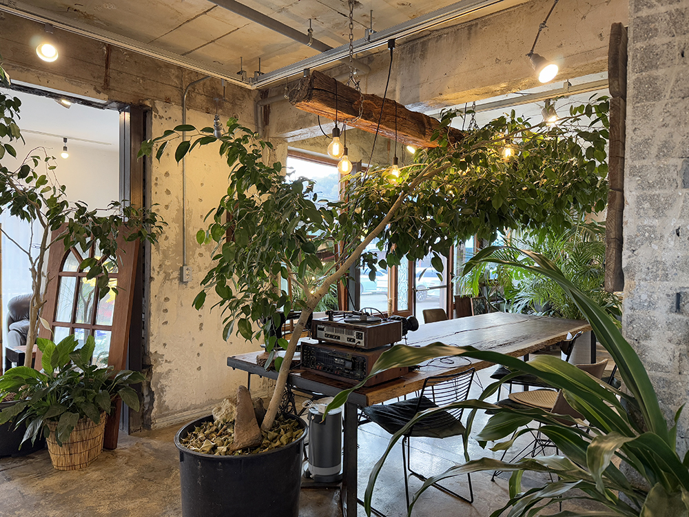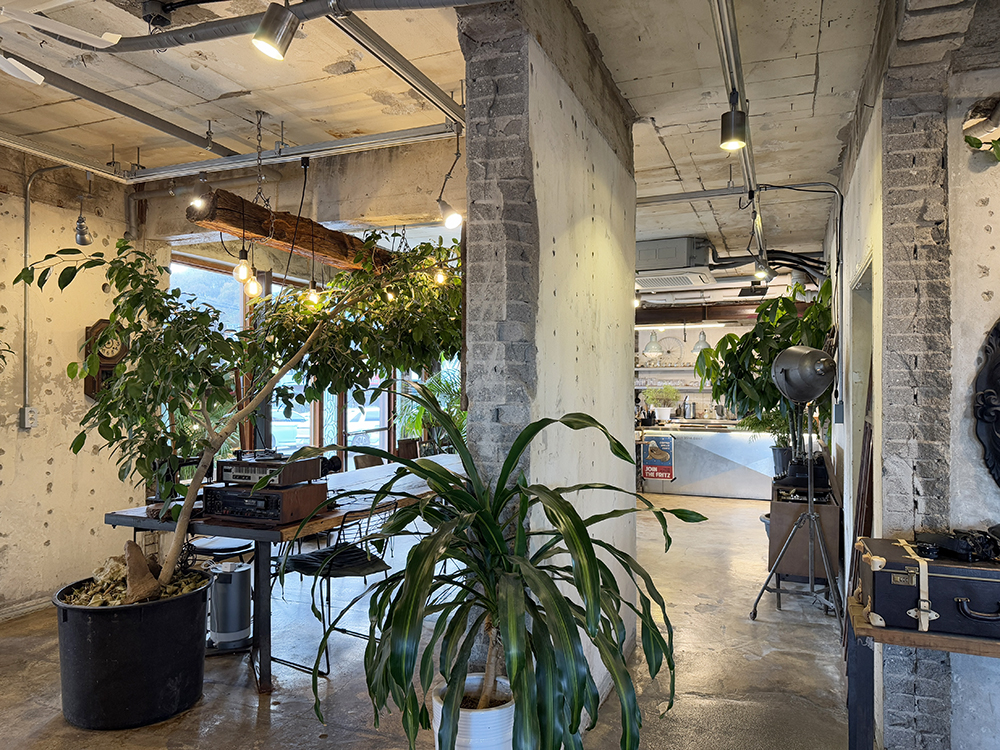 노출 콘크리트에 플랜테리어가 돋보이는 카페 내부가 인상적이었어요.