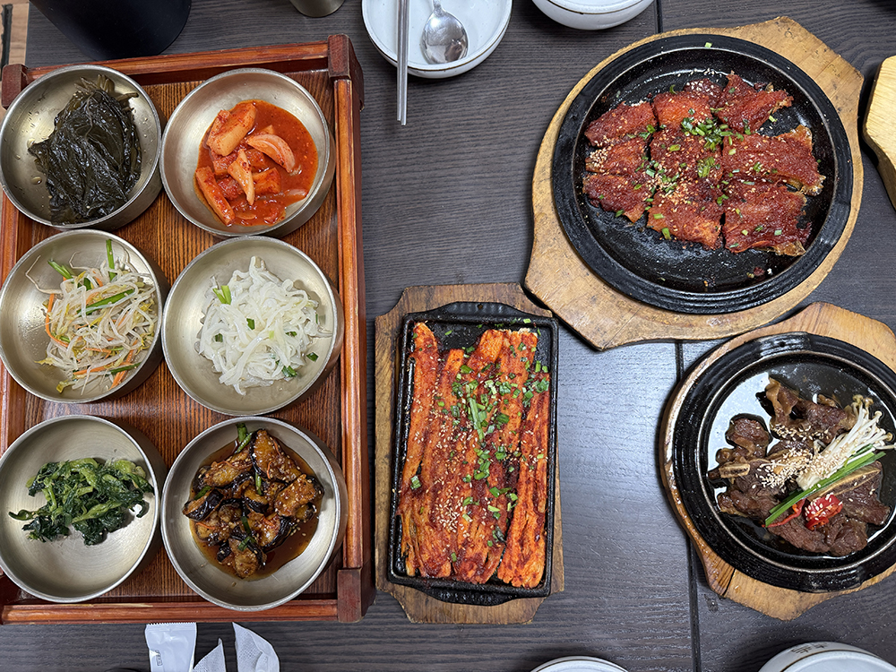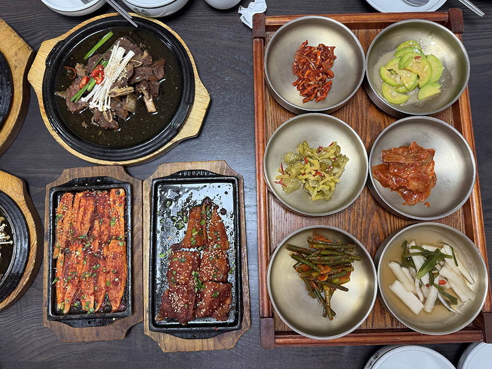 전통 한정식 스타일로 밥과 여러가지 반찬, 더덕구이, 황태구이, 소갈비찜 등 메인 요리가 함께 나오는 한상차림으로 나옵니다.