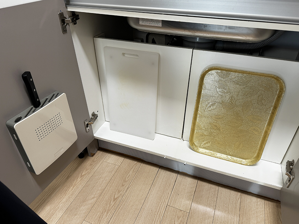 주방칼과 도마, 큰 쟁반 1개 있습니다.