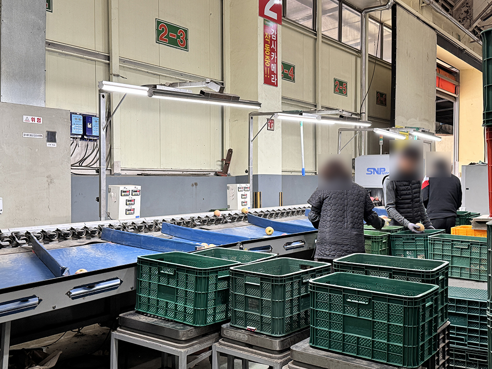 선별기로 사과를 규격별로 정확하게 분류하여 박스에 담는 작업을 거쳐 전국 각지로 나갑니다.
