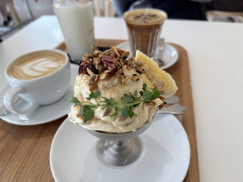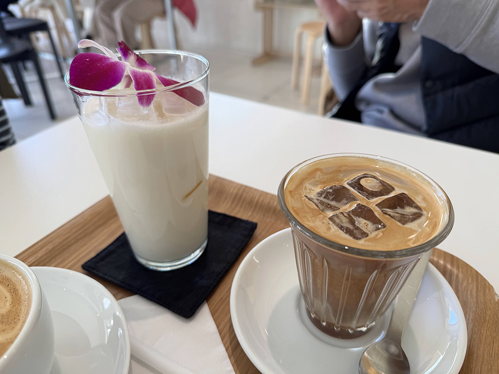 (왼쪽 상단부터 시계방향으로) 코코넛 바나나 밀크, 코르타도 ice, 푸딩, 바닐라 밀크 라떼 hot