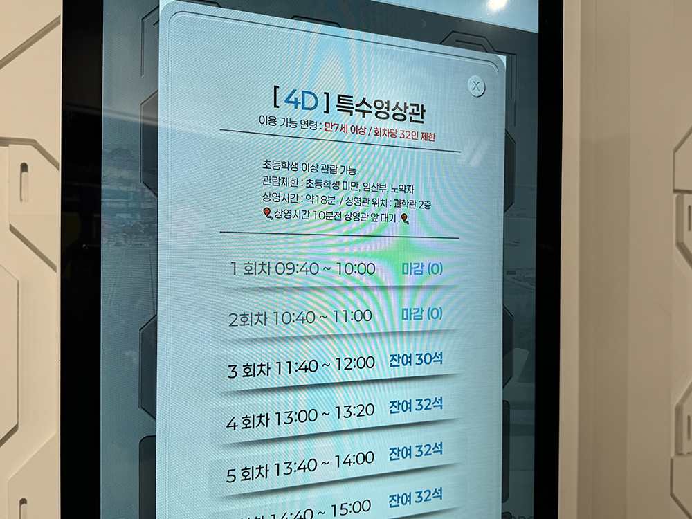 4D 특수영상관은 회차별로 마감된 것도 있어서 시간이 안 맞아 보지를 못했어요.