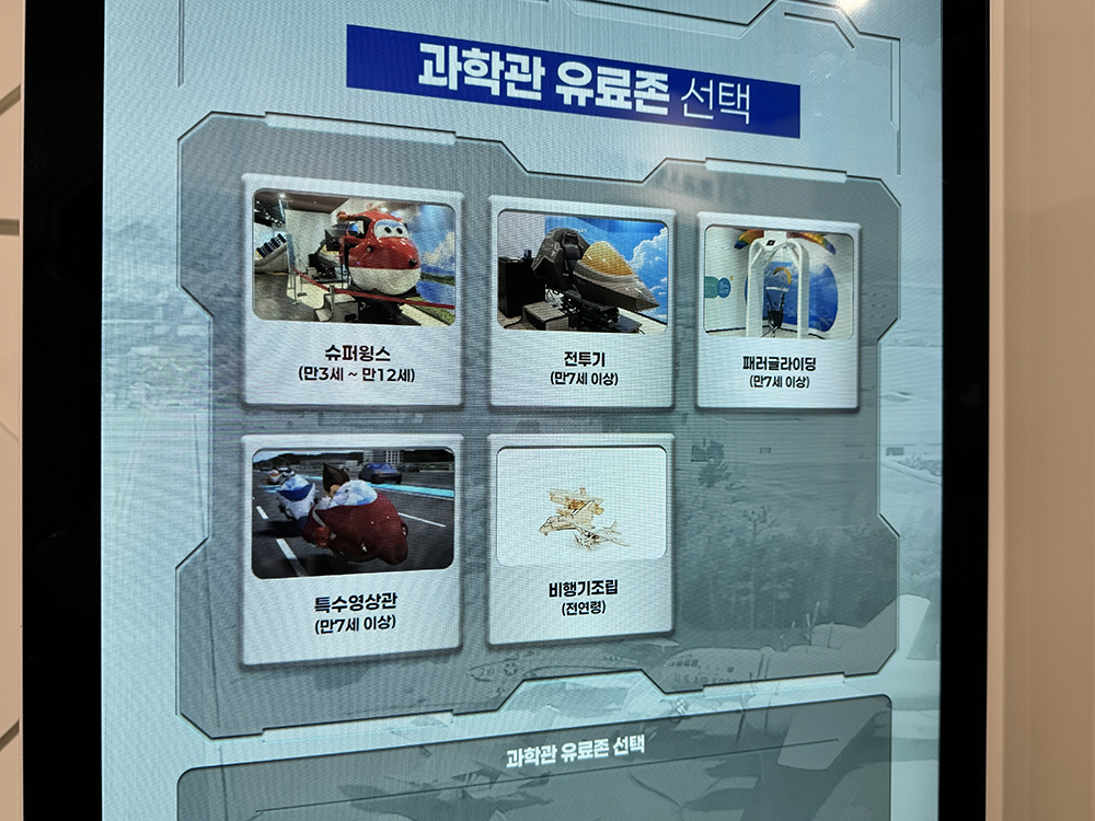 유료 체험은 슈퍼윙스, 전투기, 패러글라이딩, 특수영상관, 비행기조립 등 5개가 있습니다.