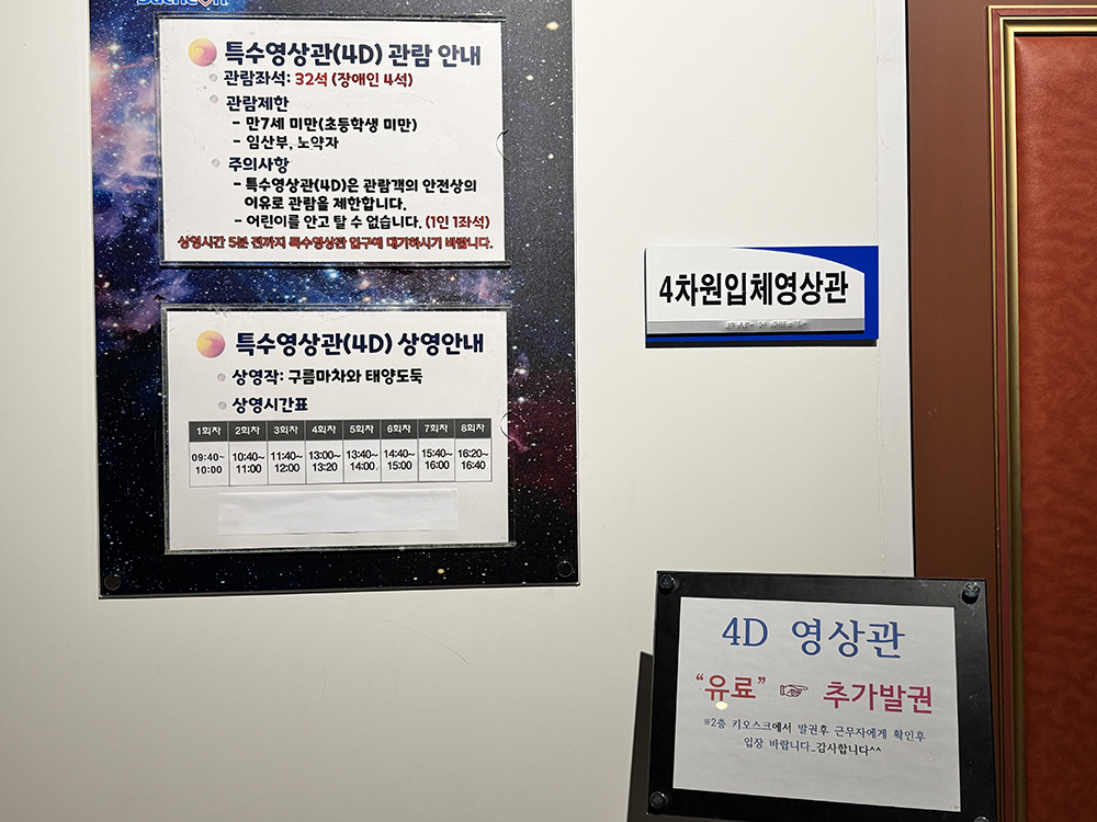 그 중 4D 입체영상관은 상영 시간에 맞춰서 미리 예약 후 결제를 해야 시청할 수 있습니다.