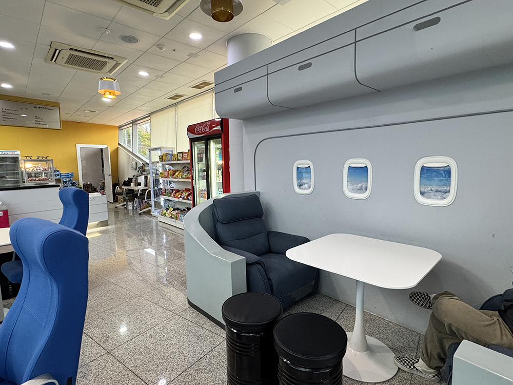 카페 의자가 항공기 좌석처럼 생겼어요.